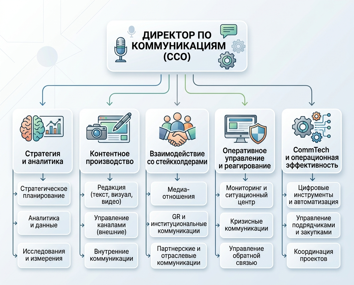 Сквозные процессы | Коммуникационные процессы проходят через функциональные границы | Единый цикл производства контента от стратегии до замера эффекта |